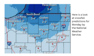 Lake effect snow will then ramp up on Monday morning with 1-2 two inches of snow expected in Warsaw, the weather service said.